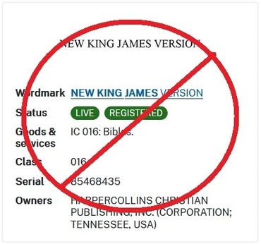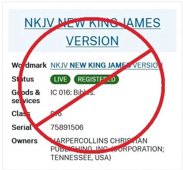 Now, the publisher tries to fool people by trading off the name King James. In fact, they own a federal trademark registration to trade off the name of the original King James Bible, which has been in the public domain since 1611. By definition and law, trademark registrations protect brands for goods sold in commerce. However, the book associated with the New King James Version trademarks cannot be the King James Bible or the trademark couldn't be registered. That's trademark law!